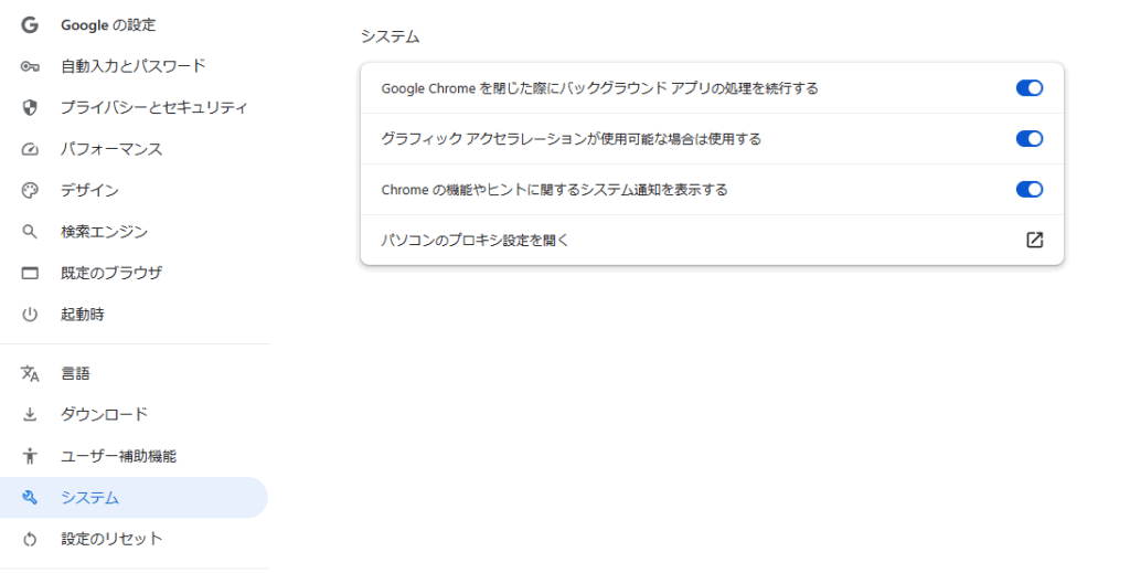 - 設定 → システムとパフォーマンス →
