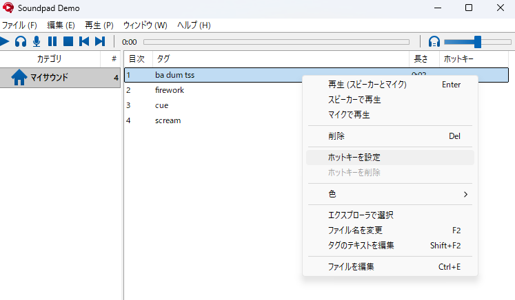 Soundpadでは、サンプルボイスや効果音ごとにホットキーを設定できます。